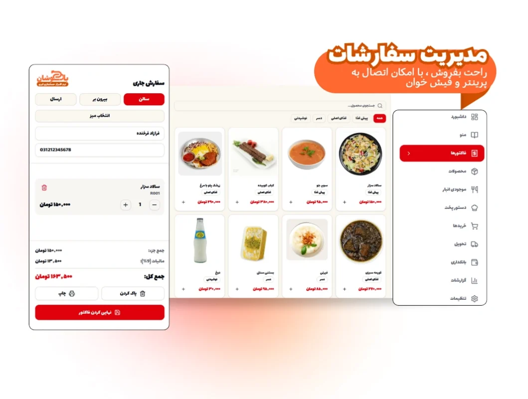 به آسان ترین و سریع ترین شکل ممکن فاکتور خود را ثبت و آشپزخانه بفرستید تا اتوماسیون مجموعه شما شروع به کار کند .